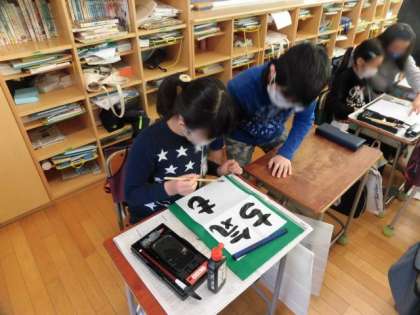初(はじ)めての習字(しゅうじ)に2年生は楽しく取り組むことができました。