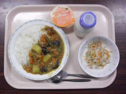 1学期最後の給食の献立は、夏野菜のカレーライス・牛乳・福神漬・キャベツサラダ・セレクトシャーベットです。