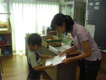 教室では通知表を担任の先生から受け取ります。1年生は初めての通知表です。先生から説明をしていただいてから受け取ります。受け取るときは皆「ありがとうございます」とお礼のあいさつもします。