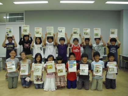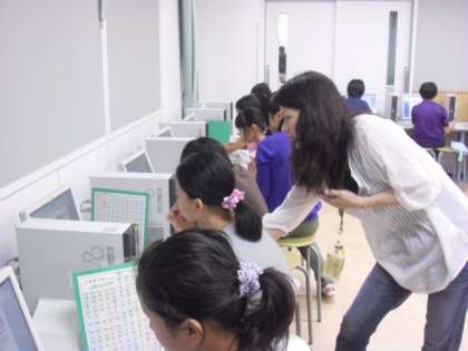 この写真は「PC教室」の様子です。「自慢新聞を作ろう」をテーマにA4版1枚の新聞を作りました。お母さん自慢や妹自慢、弟自慢などとても楽しく心温まる新聞ができました。お手伝いのお母様たちも一生懸命に教えてくれました。また、水泳教室が中止になったことで、先生方も協力しています。