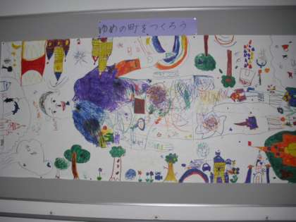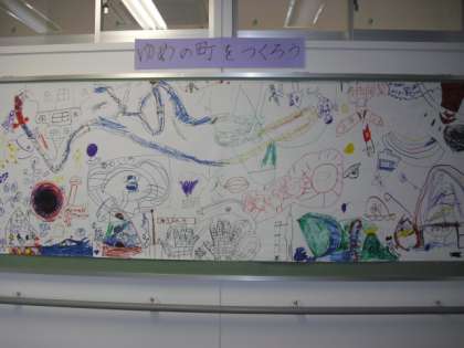 本来なら校庭の砂場で行うはずだった2年生「ゆめのまち」作り。でも、今日はあいにくの天気。そこで、模造紙をつなぎ合わせた大きな紙に、みんなで「ゆめのまち」を描きました。途中で突然、校長先生が「ガリバー!」の声とともに登場。紙の上に大の字になった「ガリバー校長先生」を縁取りながら、大いに盛り上がりました。最後に作品の前で記念写真をパチリ! 部屋の中でも楽しい「ゆめのまち」作りができました。