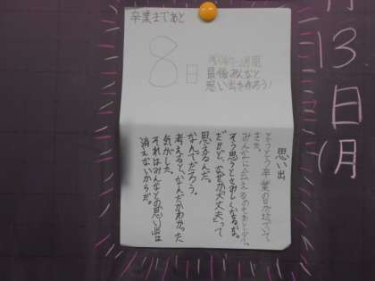 いよいよ卒業まで残り8日となりました。来週からは卒業式練習が始まります。残り少ない小学校生活を大切にすごして欲しいです。