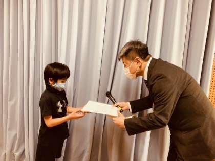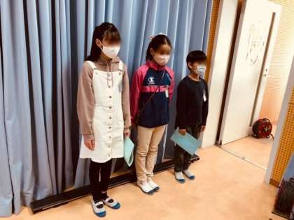 放送室で、各学年の代表児童1名が校長先生から修了証を受け取るときは、該当学年の児童全員が起立して臨みました。その後、奇数学年の代表児童が、1年間を振り返って、頑張ったことや成長したことを発表しました。皆、代表にふさわしい立派な態度でした。