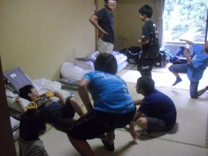 宿舎へ入室後は避難訓練を行い部屋で友達と楽しく過ごしています。周辺散策は、霧雨のため中止しました。夜のキャンプファイヤーも今日は室内レク変更です。各部屋では、友達とゆっくりゲームをしたり話したりしています。この後は、夕食です。