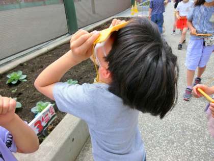 「太陽(たいよう)の反対側(はんたいがわ)に影(かげ)はできる」という予想(よそう)を確(たし)かめるために遮光板(しゃこうばん)を使って、太陽(たいよう)の位置(いち)を観察(かんさつ)しました。