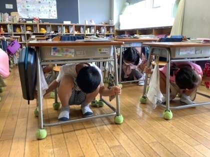 真剣に机の下に身を潜めていました。
