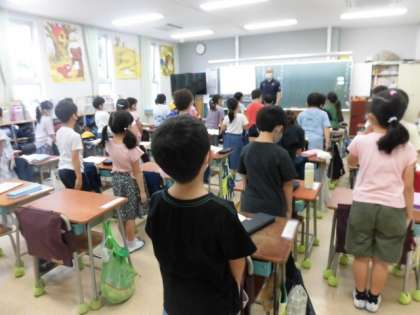 7月の全校朝会を行いました。5年生のあいさつ宣言がありました。代表児童の言葉からは、高学年としての自覚と責任感を感じました。3年生の児童が極真空手で表彰をされました。今後への想いを、全校に堂々と発表しました。