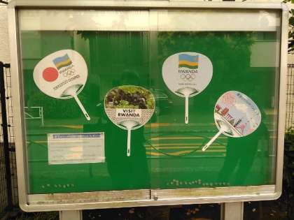 先日、深沢1丁目にある駐日ルワンダ共和国大使館からルワンダ共和国と日本を東京オリンピックで応援する団扇をいただきました。学校正門横に掲示されておりますので、ご覧ください。