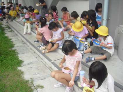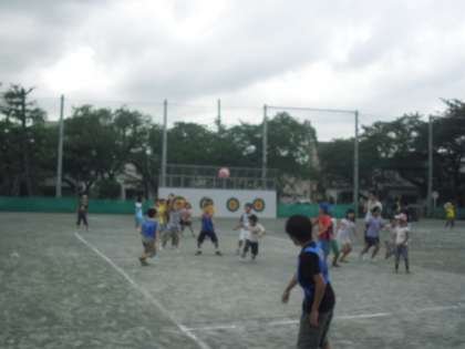 夏休み最後の日、BOPのわくわく行事です。ドッジボールで遊んで、お昼はカレーライスです。午後もドッジボールで楽しみます。