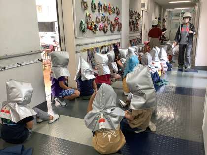 コロナウイルス感染症予防のため、偶数クラスのみ廊下に避難を行いました。