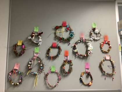 鉢植えからつるを取り、円く巻いて、好きな飾りを付けました。難しい行程もありましたが、友達と協力して、それぞれお気に入りのリースを完成させることができました。