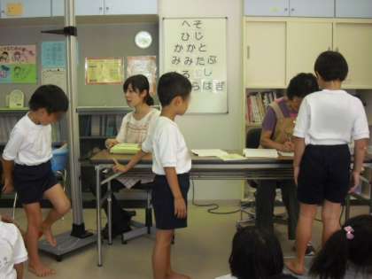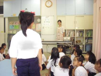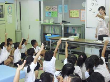 さて、各学年の計測の前に、学年に応じて高橋かほり養護教諭が、保健指導を行いました。今日の1年生は、へそ・ひざ・ひじ・かかと・みみたぶ・ふくらはぎといった「体の部分の名前」について、クイズ形式で学習しました。