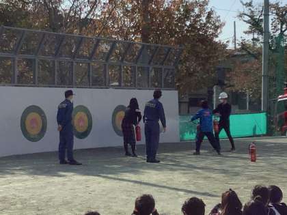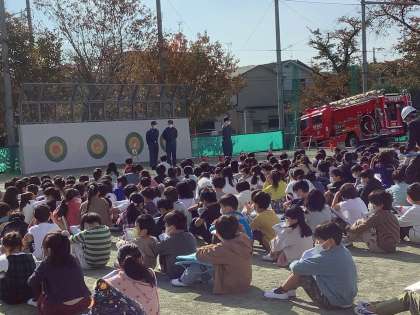 地震・火事を想定してグラウンドに避難しました。