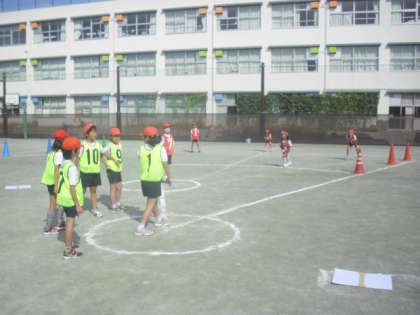 1時間目 4年生の体育です。「ハンドベースボール」のゲームです。