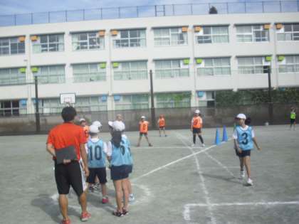 ゲームの前にあいさつをして始まります。ゲームはセルフジャッジ(自分たちで審判もする)ですから公正さが大切です。自分のチームに不利であっても正確にジャッジする子どもたちには「フェアプレー賞」と声をかけました。