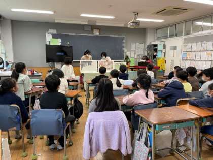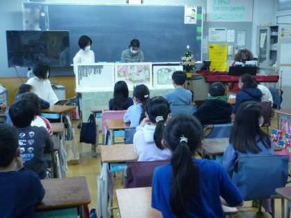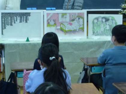 3年生は、昨日と今日の2日間、DKO(読書活動応援隊)の皆様から本を読んでいただきました。「ことばあそびうた」「ぶたくんと100ぴきのおおかみ」「ちいさなもみのき」の3冊です。美しい演奏が流れるなかでの読み聞かせで、子供たちは、すてきな時間を過ごすことができました。一足早いクリスマスプレゼントです。DKOの皆様、ありがとうございました。