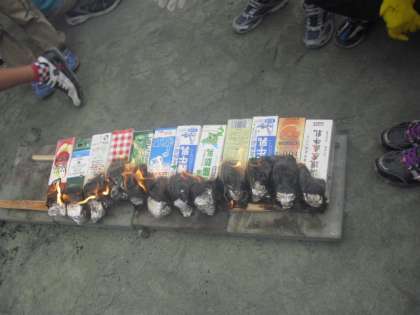 牛乳パックに詰めて焼きます。焼きあがった後はみんなでいただきます。