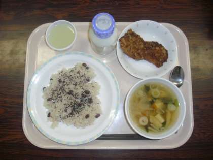 今日の献立は、赤飯、牛乳、豚肉の竜田揚げ、沢煮椀、りんごゼリーです。