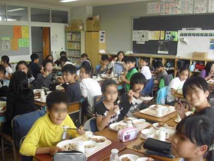 今日の給食は、学校の誕生日をお祝いして、「お赤飯」です。日本では昔からお祝い事やめでたい時には「お赤飯」を食べる風習があります。赤には悪いもの(邪気)を払うとされている説もあります。