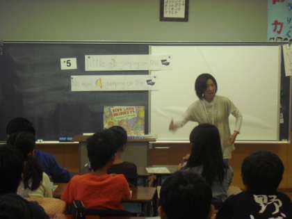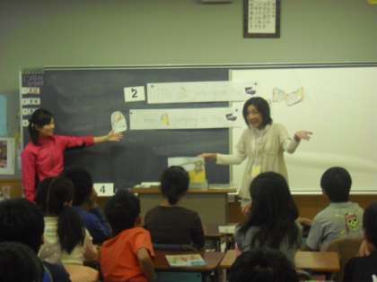 ひがしでは、各クラスに英語支援員の方に協力をいただき担任とともに学習を進めています。今日はスペシャルとして、学習のはじめに英語の絵本を読んでいただきました。