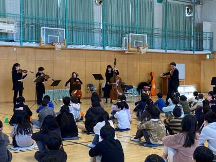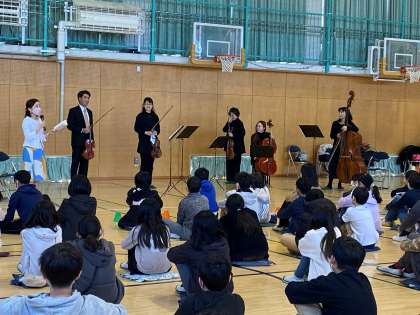東京フィルハーモニー交響楽団の方をお迎えし、体育館で弦楽五重奏の演奏を聴きました。児童は間近で聴く美しい音色や迫力ある演奏に魅了されていました。