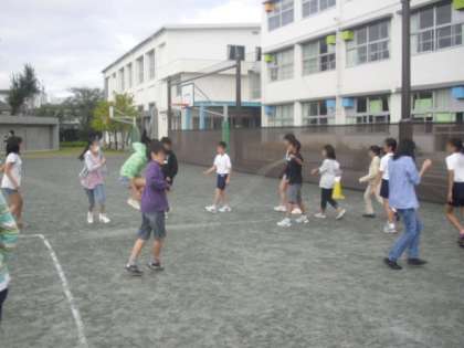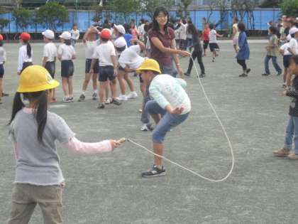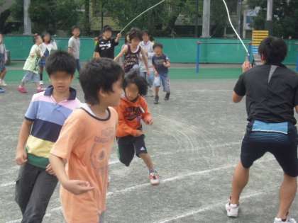 1・2年生は、回し手に先生が入りました。3・4年生は、先生が入っても入らなくてもよく、5・6年生は子どもたちが回し手をやりました。回し手の技術も大変重要で、簡単にはできません。中学年以上になると、「ハイ、ハイ……」と互いに声を出してリズムを取りながらどの子も真剣な表情でとんでいる姿が印象的でした。