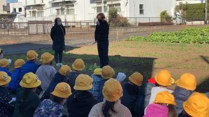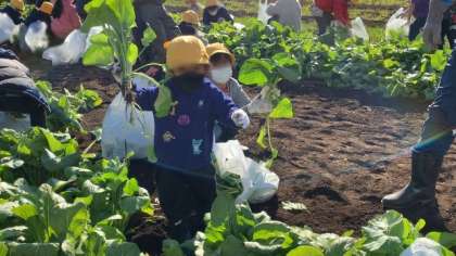 感染症対策や交通安全の約束を守りながら、秋山農園で小松菜採りをしました。
