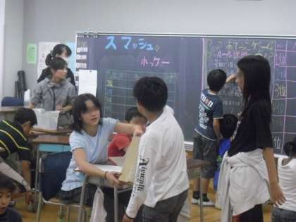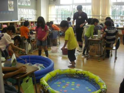 明日は子どもたちみんなが楽しみにしている東まつりです。今日は、どのクラスも全員が協力して準備を進めていました。今年のテーマは「エコ=資源の有効活用」がテーマです。