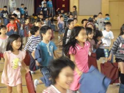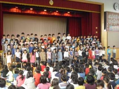 1年生が2曲発表した後で、1〜6年生全員で「さんぽ」を歌いました。歌い終わると上級生から大きな拍手をもらいました。