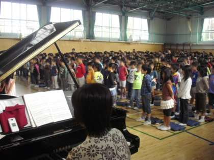 1年生が音楽朝会で「もりのくまさん」「さんぽ」の2曲を発表しました。よく口を動かしてはっきり歌う練習をしてきた1年生。少し緊張しながらもきれいな声ではっきりと歌うことができました。