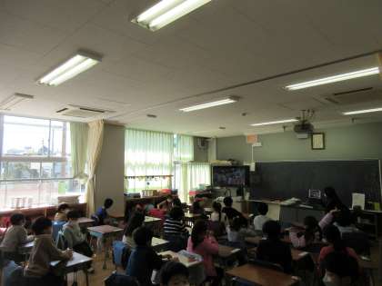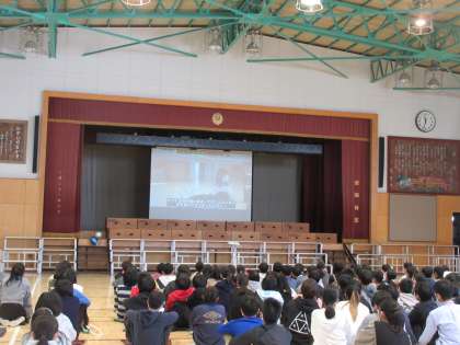 体育館に6年生が集まり、他の学年は各教室からオンラインでの参加となりました。