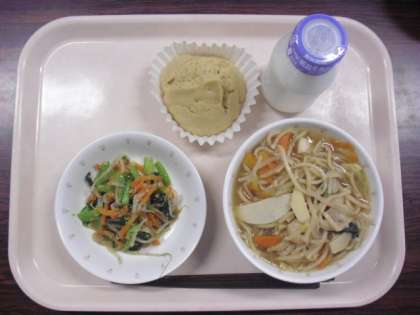 今日の給食は、チャンポン麺・野菜のごまあえ・黒糖入り蒸しパン・牛乳です。