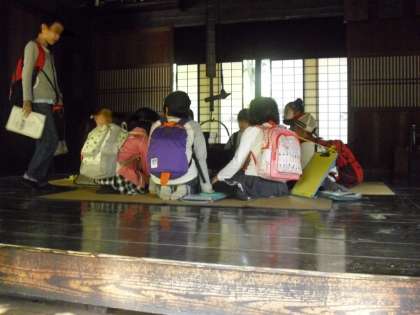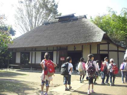 その後、次大夫堀公園の中を見学しました。昔の建物や道具などを間近で見て、「江戸時代に来たみたい。」「昔の家の階段ってすごく急なんだね。」「家の中に上座下座があるなんて初めて知った。」など、現在の、家や暮らしとの違いについて知ることができました。また、心を落ち着かせて静かに囲炉裏に耳を傾け、「火が燃え移るとパチパチした音がするんだ。」とその場の雰囲気を味わう姿も見られました。