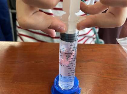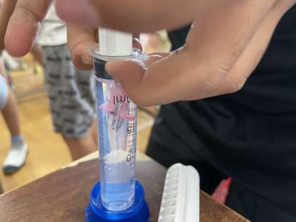 前回は、空気を押すとくじらのスポンジは縮み、空気の体積が小さくなるという学習しました。それを踏まえて、今回は、水を押してみるとどうなるのかを考えました。