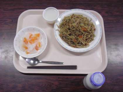 献立は、牛乳・ソース焼きそば・大根の甘酢かけ・ホワイトゼリーです。