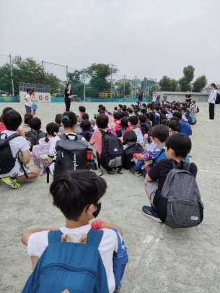 出発式では、3年生全員で笑顔いっぱいの遠足にすることを約束しました。