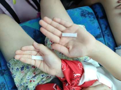 出発すると担任からバスに酔わないための「おまじない」が希望者に配られました。