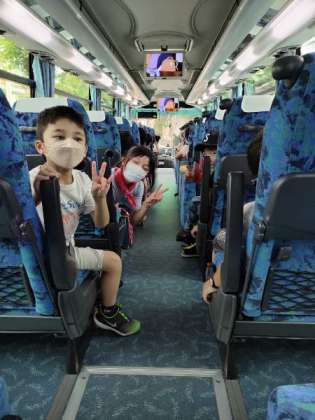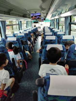 学校に向かって、帰りのバスの中では…DVDを見ながら、クールダウンです。