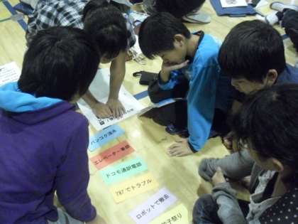 はじめは、ニュースができるまでをビデオで詳しく説明してもらいました。そして、グループごとに分かれて、6つのニュース項目から3つを選択し放送する順番を決めました。自分たちが選んだ理由も皆の前で発表しました。次は自分たちが選んだニュースを放送する体験です。アナウンサーやカメラマン、ミキサーに役割を分担し放送しました。