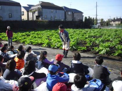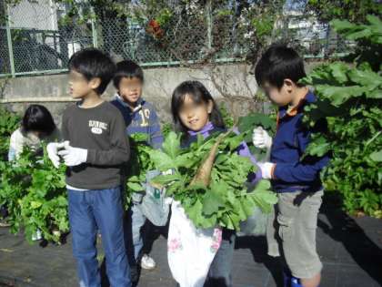 説明を聞いた子どもたち,いよいよ大根を抜く時がきました。大根1本に狙いを定め,腰をしっかりと落として大根をつかみました。「うんとこしょ,どっこいしょ。」と声を出しながら,太陽に向かって一生懸命引っ張ります。台風にも負けなかった大根は,とても大きくてなかなか抜けません。「誰か手伝って!!」と助けを求め,友達と息を合わせて大根をつかみます。すると,1人では全然抜けなかった大根が『スポッ』といい音で抜けました。「すごく重いよ。」「葉っぱが大きい。」「持ってきた袋から,大根が出ちゃうよ。」と笑顔で抜いた大根を見せに来てくれました。大根を抜いた後には,「ありがとう。」と感謝の気持ちを言って穴を埋めました。