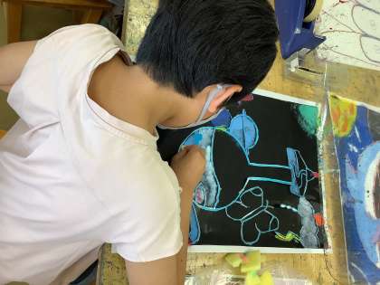 カッターやはさみで型をつくってから絵の具で着彩を行う、根気のいる作業を一生けん命行っています。
