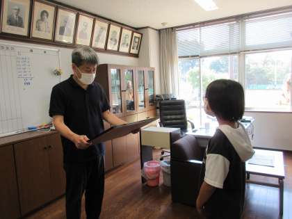 7月の全校朝会では、先日、警視総監から贈られた感謝状について全校に紹介されました。