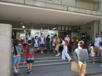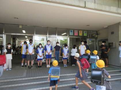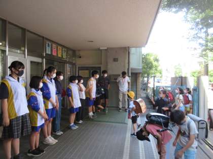 中学生に迎えられて、ちょっぴり恥ずかしそうにしている子もいましたが、心をこめてあいさつを交わす様子はなんとも微笑ましい光景でした。