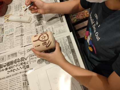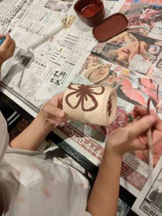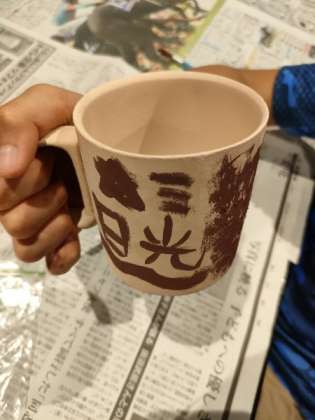 益子焼の素焼きしたカップに事前に用意した下絵をもとにして、絵や文字を描きます。