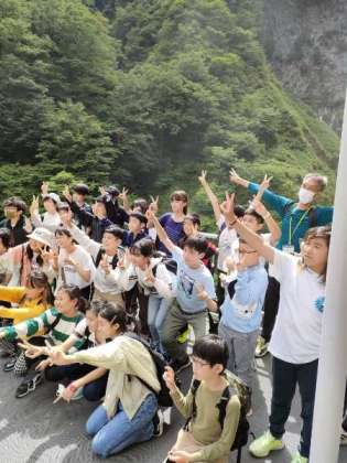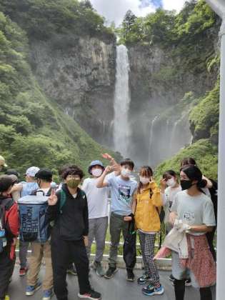 華厳の滝にエレベーターで降りる前に売店でお土産を買う児童もいます。