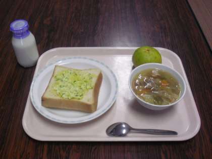 給食のメニューは、「エッグトースト、牛乳、白いんげんの田舎風スープ、早香(みかん)」です。