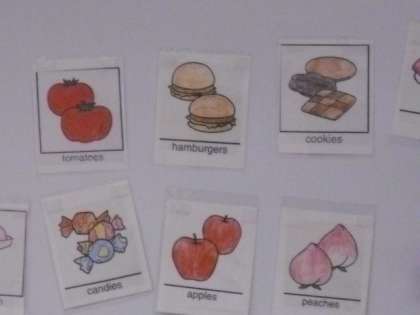 まず、英語の歌から「食べ物」を聞き取りました。子どもたちは真剣に歌を聞いていたので、聞き取った食べ物を、英語でどんどん発表することができました。英語の先生からも“Good job”とほめられ、とてもうれしそうでした。