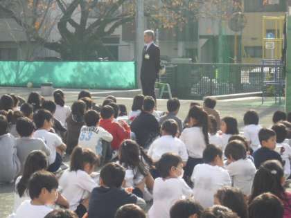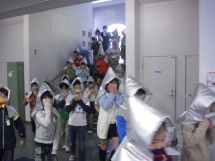 予告なしの避難訓練です。家庭科室から出火した想定で校庭へ避難します。