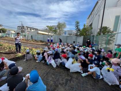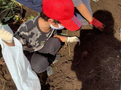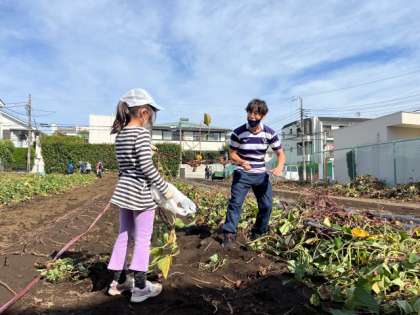 秋晴れの中、駒沢の畑に元気に出発しました。つるがたくさん伸びていて掘るのが大変でしたが、およそ1時間全力で頑張りました。