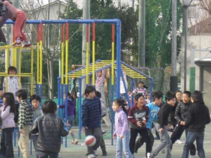 休み時間は、校庭で元気に遊ぶお友達がたくさんです。久しぶりに会った友達と歓声をあげながら楽しみました。